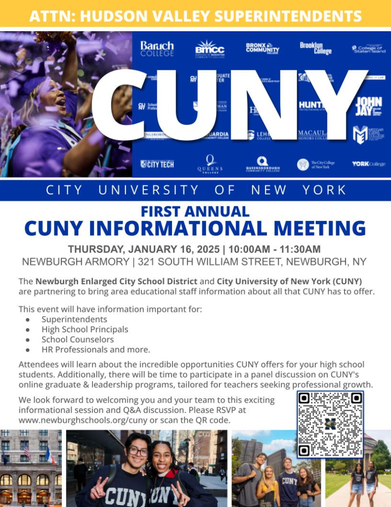 We look forward to welcoming you and your team to this exciting informational session and Q&A discussion. Please RSVP at www.newburghschools.org/cuny or scan the QR code.