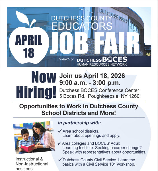 Have you considered putting your talents and abilities to use in an educational setting? School districts throughout the region are gathering at Dutchess BOCES on April 18 from 9 a.m.-3 p.m. for the Educators Job Fair.
